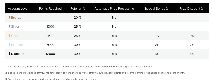 After your account is created, you can log in and proceed to access the paid surveys, offer walls, and other earning opportunities. One characteristic of PrizeRebel is that it has different membership levels. Prize Rebel levels are simply statuses that you reach as you complete tasks and earn points. There are 5 levels – Bronze, Silver, Gold, Platinum, and Diamond.